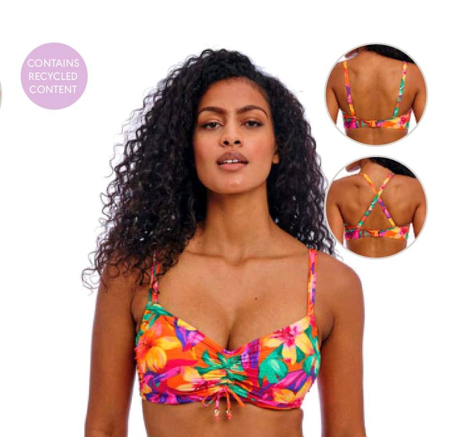 Questo top bikini della marca Freya presenta una vivace fantasia tropicale con colori accesi come arancione, rosa, verde e viola. Il modello è dotato di coppe leggermente sagomate e una gathering centrale regolabile con laccetto, che permette di personalizzare la vestibilità. Le spalline sono regolabili e possono essere indossate sia dritte che incrociate sulla schiena, offrendo maggiore supporto e versatilità. Il costume è realizzato con materiali contenenti fibre riciclate, come indicato dal bollino “Contains Recycled Content”.